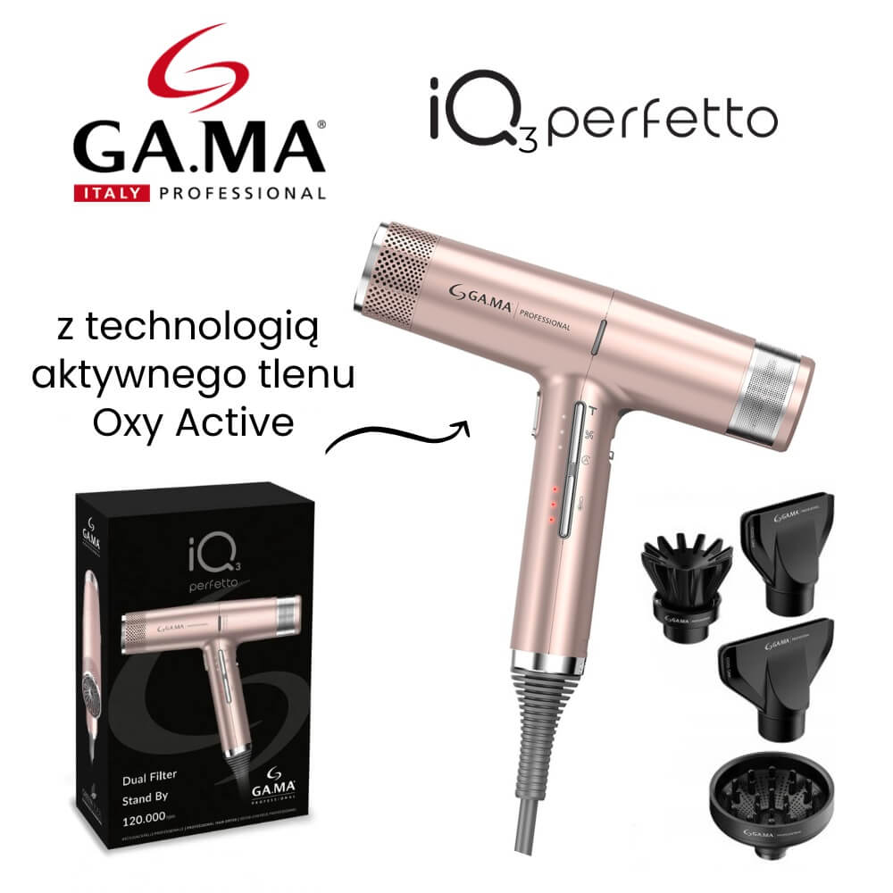 Ga.ma iQ3 Perfetto, to ultralekka i kompaktowa suszarka do włosów o mocy 1600-2000w.. Posiada inteligentny silnik bezszczotkowy o prędkości 120 000 obr./min z technologią wydłużającą jego żywotność. Suszarka została wyposażona w jonizację oraz technologię Oxy Active wykorzystującą antybakteryjne i odmładzające właściwości aktywnego tlenu. Aktywny tlen uszczelnia łuski, dzięki czemu kolor włosów jest dłużej intensywny, a włosy niesamowicie gładkie. W suszarce wykorzystano efekt Venturiego, który polega na zwielokrotnieniu przepływu powietrza, dzięki czemu czas suszenia jest krótszy nawet o 30%. Suszarka posiada mikrofiltr, który zabezpiecza silnik przed zabrudzeniami, co przedłuża żywotność suszarki. Dodatkowo technologia Auto-Clean obraca turbinę silnikową, co umożliwia dokładne czyszczenie filtra i usunięcie z niego wszelkich zabrudzeń. Technologia Memory Function zapamiętuje prędkość z 12 dostępnych konfiguracji, a wszystkimi konfiguracjami możesz zarządzać za pomocą wygodnego, cyfrowego interfejsu. Do urządzenia dołączono takie akcesoria jak: dysza gwiazdka (Venturi), dysze magnetyczne o dwuwarstwowej konstrukcji, głęboki dyfuzor, kółeczko do zawieszenia oraz szczoteczka do czyszczenia.