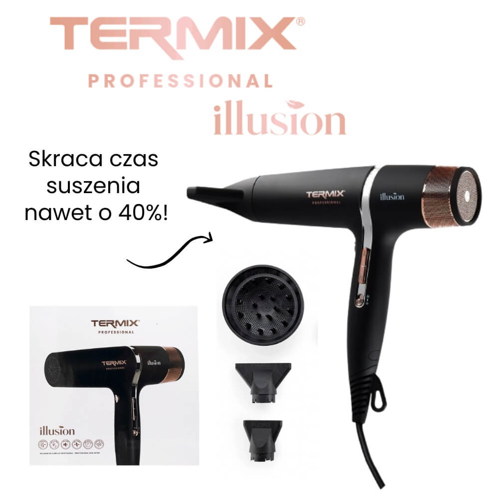 Kolejną wartą uwagi propozycją jest suszarka z jonizacją Termix Illusion. To profesjonalne urządzenie, które łączy w sobie lekkość, moc i nowoczesną technologię. Wyposażona w rewolucyjny, cichy silnik BLDC, który skraca czas suszenia o około 40% i to bez konieczności stosowania wysokich temperatur. Urządzenie umożliwia regulację siły nawiewu i temperatury powietrza na 3 poziomach, ponadto posiada przycisk zimnego powietrza, dzięki któremu dodatkowo utrwalisz stylizację. Technologia jonowa domyka łuski włosów i zapobiega puszeniu i elektryzowaniu się włosów, co pozwala osiągnąć gładszy, delikatniejszy i bardziej błyszczący efekt. Suszarka Termix Illusion posiada funkcję samooczyszczania, która eliminuje nagromadzony kurz, włosy i zanieczyszczenia (mogące zatykać filtry), dzięki czemu urządzenie utrzymuje stały i wydajny przepływ powietrza oraz długą żywotność suszarki - ponad 2000 godzin użytkowania. Suszarka Termix Illusion jest bardzo lekka - jej ciężar wynosi zaledwie 400g, dzięki czemu nie obciąża nadgarstka nawet podczas intensywnej pracy. W zestawie znajduje się dyfuzor i dwa koncentratory, a optymalnie długi, 3-metrowy kabel w żaden sposób nie ogranicza swobody ruchu. Suszarka Termix Illusion, to trwałe narzędzie o eleganckim designie, które sprosta trudom codziennego użytkowania.