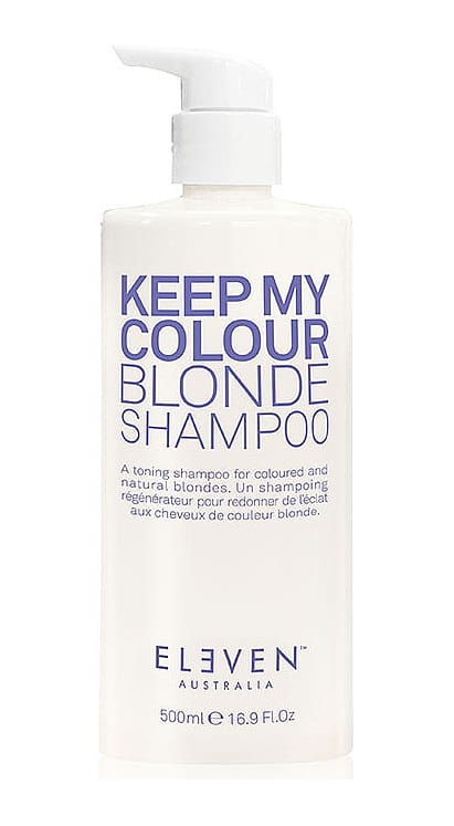 Szampon Eleven Australia Keep My Colour Blonde zawiera specjalną niebieską bazę z fioletowym pigmentem ext. Violet 2, dzięki czemu natychmiastowo i skutecznie zwalcza niechciane, żółte tony, które z czasem pojawiają się na blond włosach.