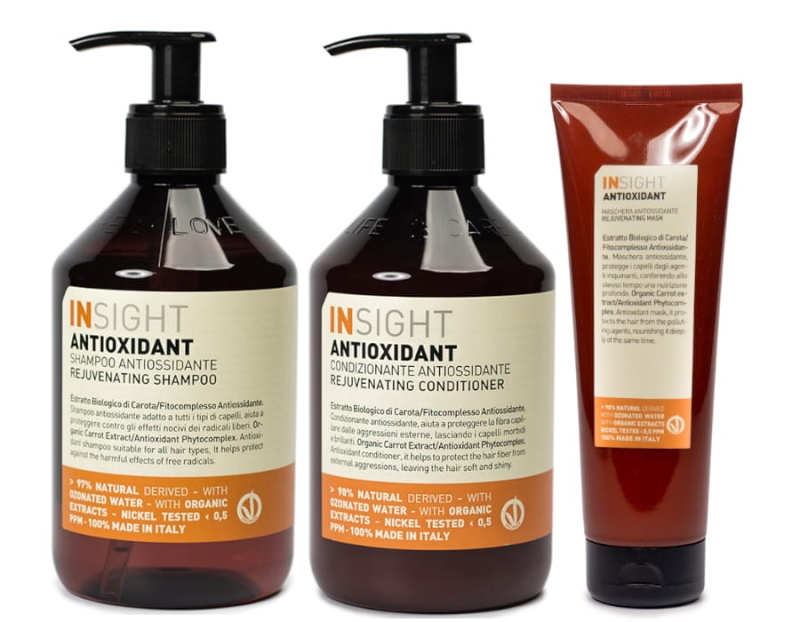 Insight Antioxidant to profesjonalne kosmetyki do pielęgnacji włosów, które sprawiają, że pasma wyglądają młodziej. Specjalnie stworzona formuła mająca w składzie organiczny ekstrakt z marchwi i odmładzający fitokompleks (masło z soi, olej jojoba, olej z orzechów laskowych) odmładza włosy, zapewnia im odpowiednie nawilżenie oraz ma działanie antyoksydacyjne.