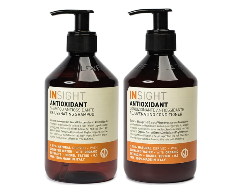 Insight Antioxidant to profesjonalne kosmetyki do pielęgnacji włosów, które sprawiają, że pasma wyglądają młodziej. Specjalnie stworzona formuła mająca w składzie organiczny ekstrakt z marchwi i odmładzający fitokompleks (masło z soi, olej jojoba, olej z orzechów laskowych) odmładza włosy, zapewnia im odpowiednie nawilżenie oraz ma działanie antyoksydacyjne.