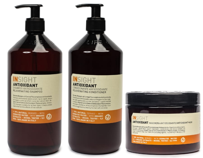 Insight Antioxidant to profesjonalne kosmetyki do pielęgnacji włosów, które sprawiają, że pasma wyglądają młodziej. Specjalnie stworzona formuła mająca w składzie organiczny ekstrakt z marchwi i odmładzający fitokompleks (masło z soi, olej jojoba, olej z orzechów laskowych) odmładza włosy, zapewnia im odpowiednie nawilżenie oraz ma działanie antyoksydacyjne.