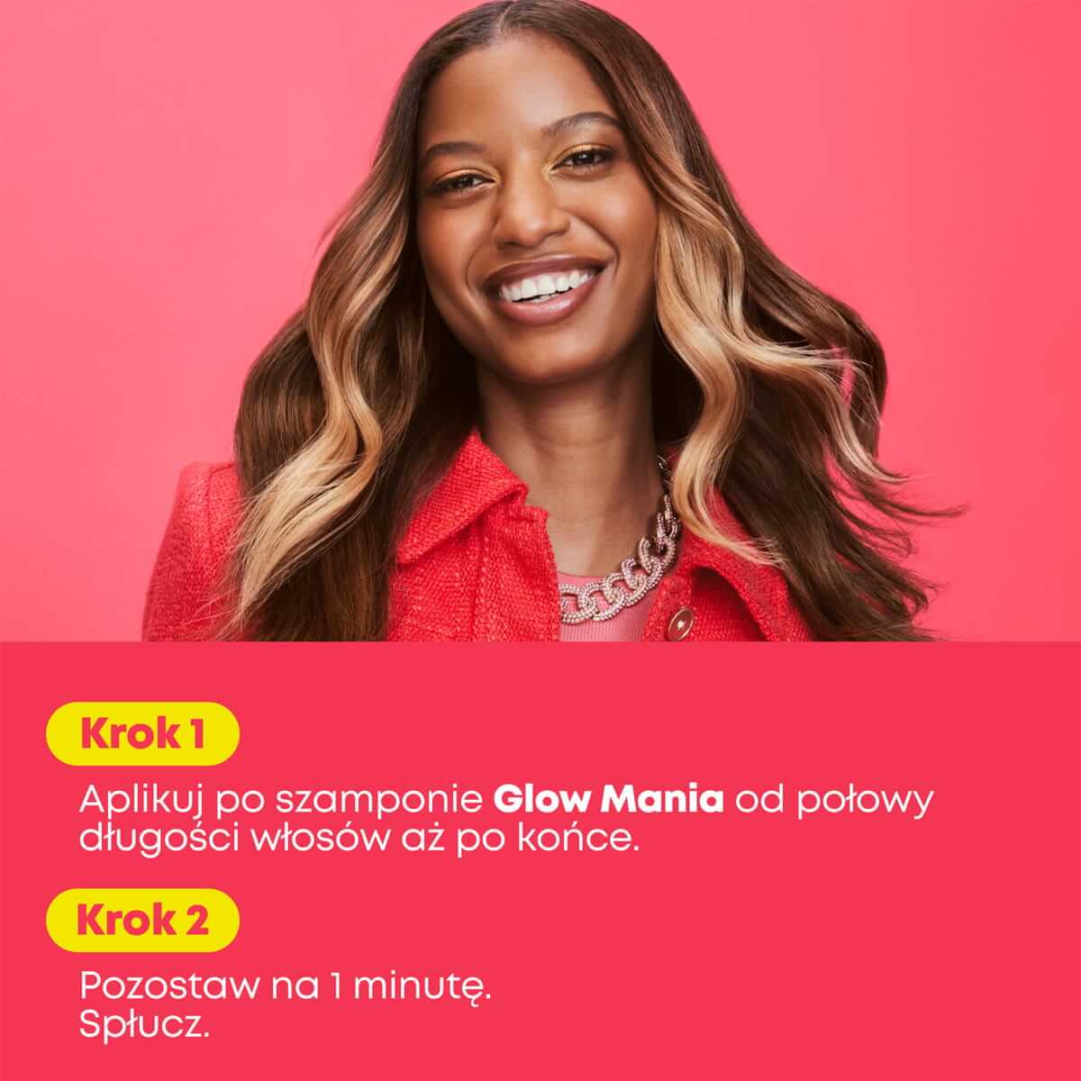 Aplikuj na umyte włosy od połowy ich długości aż po końce, omijając skórę głowy i oczy. Pozostaw na 1 minutę, a następnie dokładnie spłucz. W przypadku dostania się preparatu do oczu, natychmiast przepłukać je wodą. Dla najlepszych rezultatów stosuj w połączeniu z innymi produktami Matrix Glow Mania.