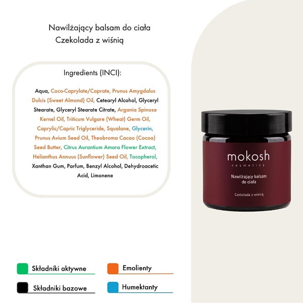 Jeśli szukasz aromatycznego i wegańskiego balsamu do ciała, który pobudza zmysły, to Mokosh balsam do ciała Czekolada z wiśnią spełni Twoje oczekiwania!