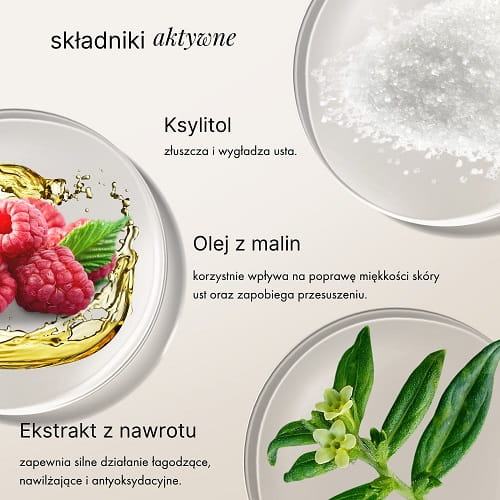 - peelingujące mikrodrobinki ksylitolu: doskonale złuszczają martwy naskórek i wygładzają.